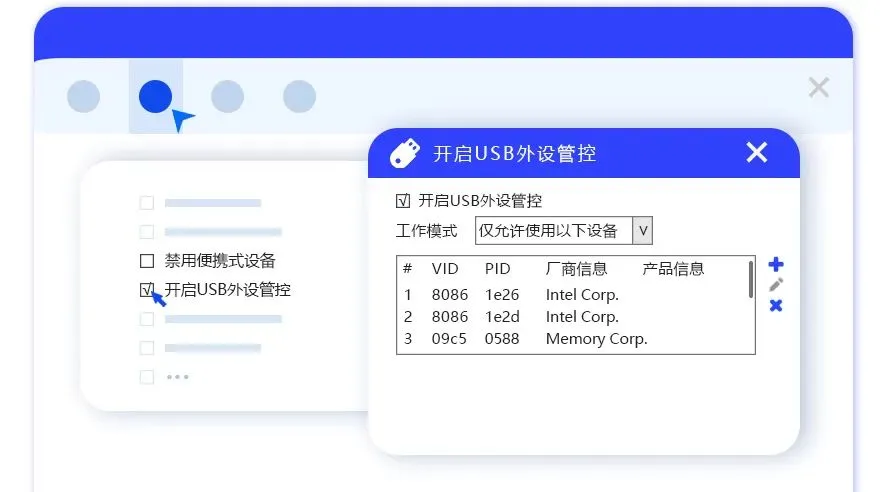 采用可信授权管理模式进行验证,移动存储设备只有通过安全可信验证后才可使用。支持禁用U盘、移动硬盘、智能手机,创建加密U盘,禁止使用所有USB存储和外接设备等。